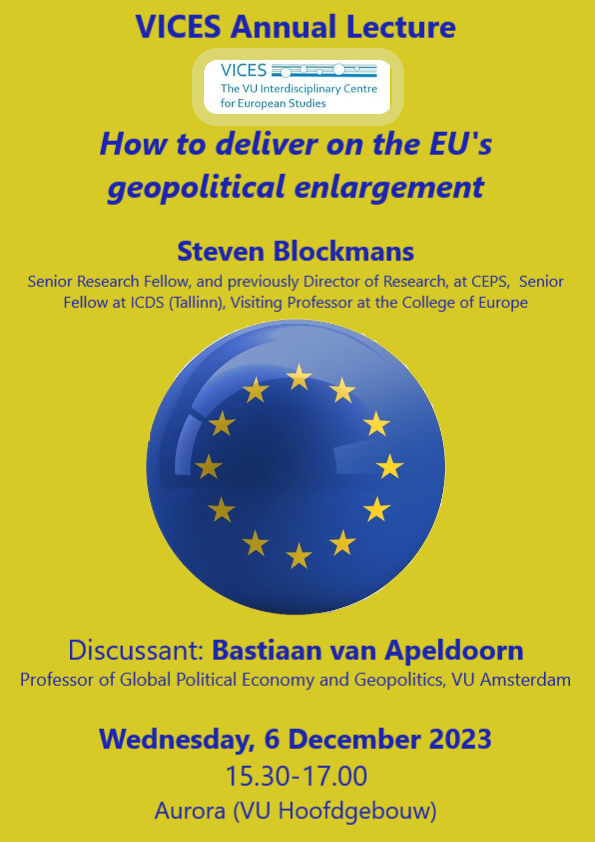 6 December 2023: VICES Annual Lecture "How to deliver on the EU's geopolitical enlargement" with Steven Blockmans, Senior Fellow, and former Director of Research at CEPS (Brussels), Senior Fellow at the Estonian Foreign Policy Institute at ICDS (Tallinn), Visiting Professor at the College of Europe (Bruges and Natolin), and Editor-in-Chief of the European Foreign Affairs Review. 6 December 2023, 15.30-17.00, Aurora (Hoofdgebouw)
