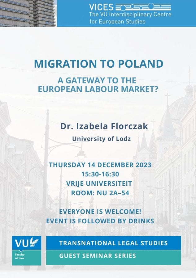 14 December 2023: VICES/ TLS Guest Speaker Series "Migration to Poland: A Gateway to the European Labour Market", Dr. Izabela Florczak (University of Lodz), 15.30-17.00, NU2A-54, organized by Imke van Gardingen