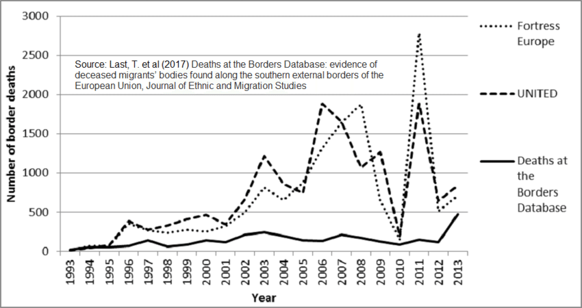 Last et al (2017) compared the Deaths at the Borders Database with news-sourced datasets on border deaths. It shows a difference in trends between news reporting of dead and missing migrants (steep increase with a dramatic dip in 2010) and the number of bodies found along southern EU borders (overall increase since early 2000s but more constant).