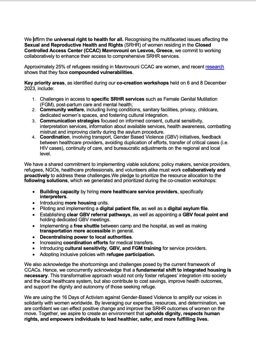 Moria Reception and Identification Centre (RIC), situated on the island of Lesbos, was Europe’s largest formal refugee camp before being destroyed by fires in September 2020. The newly constructed Closed Controlled Access Centre (CCAC) Mavrovouni replaced the notorious Moria after its destruction. Here, one in four residents is a woman of reproductive age.
