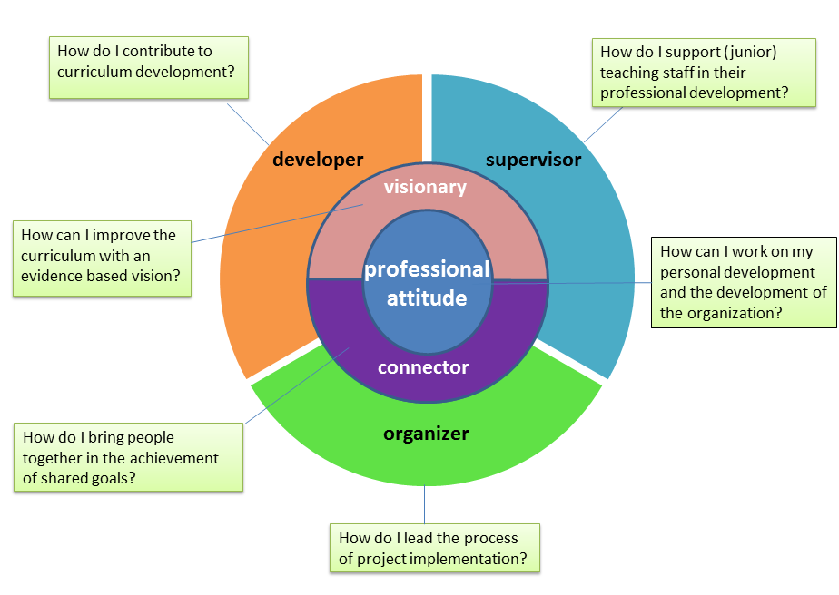 The STQ programme is closely aligned with the daily practice of senior lecturers and offers support with contemporary issues. The lecturer’s work environment (supervisor and colleagues) and the context of the work are included in the programme. The objective of the STQ programme is to confirm senior lecturers or potential senior lecturers in the various roles they perform in the field of education. The programme incorprates the various roles senior lecturers play within the organization: visionary, connector, developer, organizer and supervisor. All senior lecturers fulfil these roles – they all have a vision on education; they coordinate parts of the curriculum or groups; they are supervisor to junior lecturers; and they develop new courses. The contents and specific interpretation of these five roles is clarified in this figure.