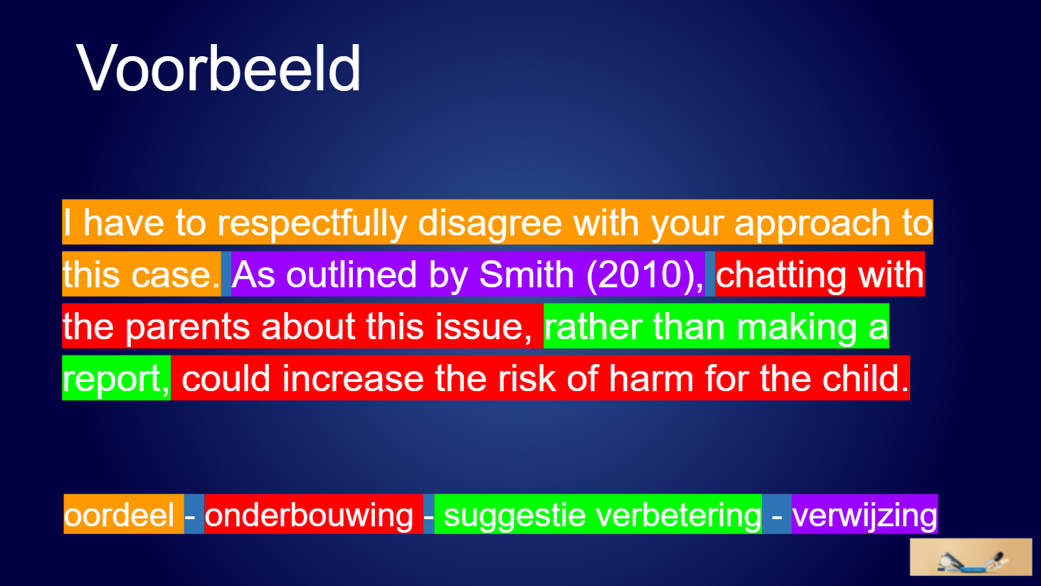 Peer feedback on academic work contains four elements: a judgment, an explanation, a suggestion for improvement, and, where possible, a reference. This can take the form of a helpful question, a compliment, or a critical remark. The most valuable feedback addresses the bigger picture. Many students giving feedback for the first time focus on details, such as spelling mistakes. However, feedback about the bigger picture, such as the research question, structure, coherence, or relevance, encourages reflection and improves the work on a higher level.
