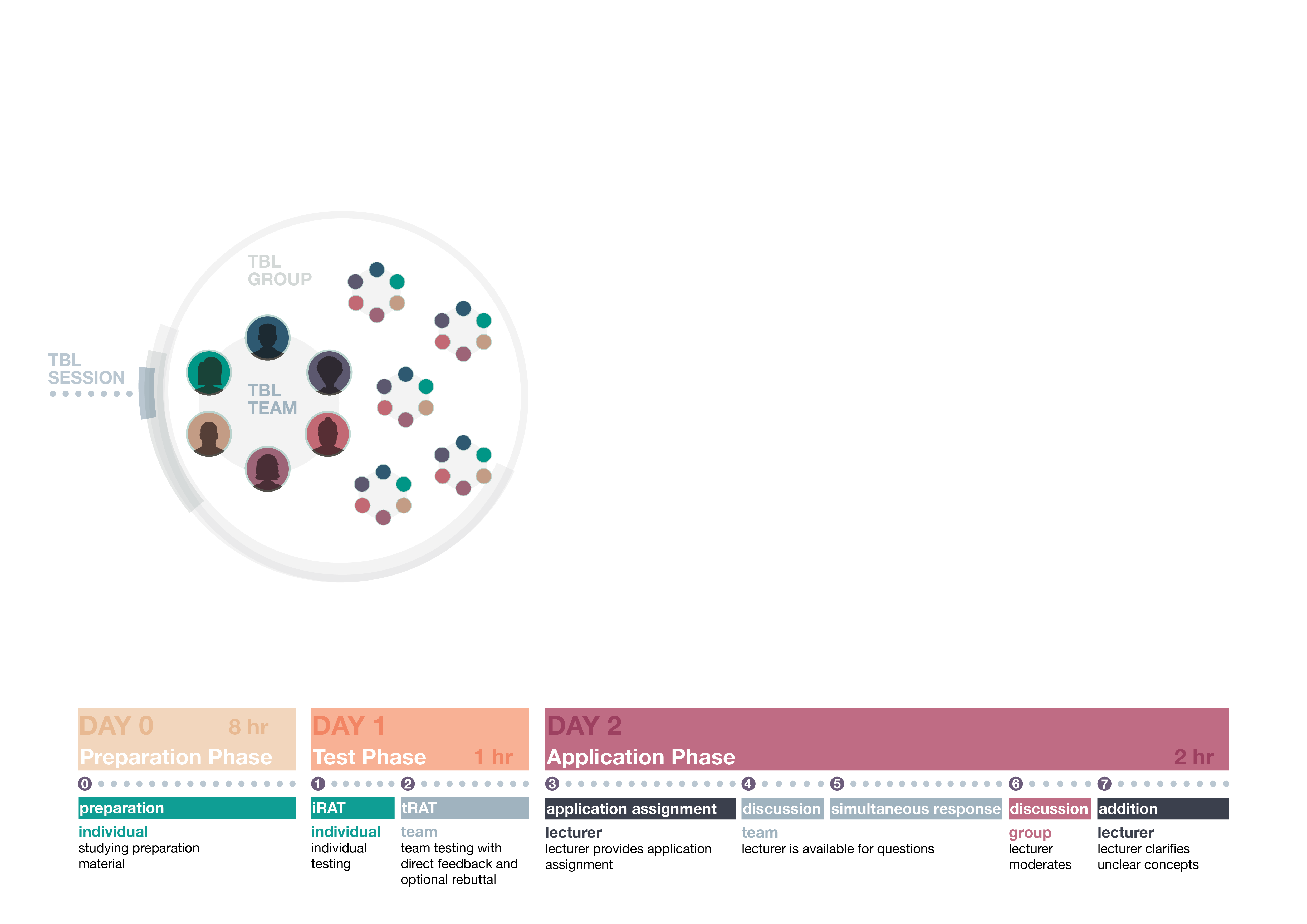 TBL is an active teaching method, also using the flipped classroom method. In TBL, students individually prepare theory or a question before each class and take a test on this subject individually, the individual Readiness Assurance Test (iRAT). Afterwards, they answer the same questions together in small teams of six students (tRAT). The correct answers are discussed in class with all groups after the test.