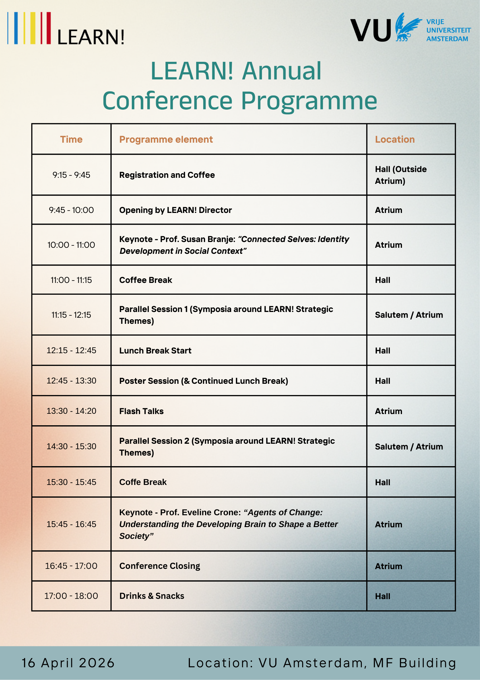 Keynote lectures by Prof. Eveline Crone and Prof. Susan Branje will explore this topic from complementary perspectives, from identity development to neurobiology, and how these processes unfold in a changing social context. The programme also includes flash talks, a poster session showcasing LEARN!’s interdisciplinary research, and symposia focused on the following themes: