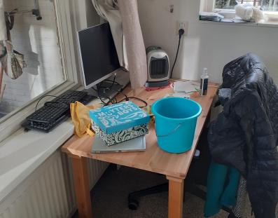 The first picture of this section highlights a common strategy developed by employees to transform their homes into offices: the use of the living room. In several instances, participants shared that their houses were small, and they could not dedicate an entire room to work. Some interviewees highlighted their preference for the campus office to perform most of their activities, while home would host very specific tasks, such as reading. This picture was taken by one of the participants of the study, who describes still working from home while ill. It highlights a more provisory situation where hybrid working emerges. Although work from home is not the preferred setting, it is effectively adopted in specific circumstances, which are unpredictable and often arise at the last minute. In that sense, the picture inspires us to consider points related to the ethics of hybrid working: when screens make the location of our bodies less relevant to work, how do we take care of ourselves and those we manage?