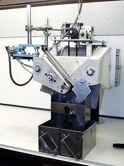Magnet and vibrating chute feed controls are on the panel on the chest. Turn on the main switch. Put some of the sample into the funnel. Place 2 collecting containers under the machine. The number of revolutions of the roll magnet is set at maximum. Slowly increase the sample feed (sample quantity), so that the sample passes smoothly. Then start a magnetic flux of 100mA at low reach. The magnetizable grains will be thrown off the rotating roll into the left tray. If there is little or no separation, gradually increase the magnetic flux (e.g. with 50 mA). Increase the magnetic flux (after some time at high reach), and collect the different fractions. Write down clearly sample number and magnetic flux etc. (e.g. cpc >450) on the small containers. Choose from those fractions the ones which will continue further processing. Zircon and apatite are in the least magnetic fraction.
