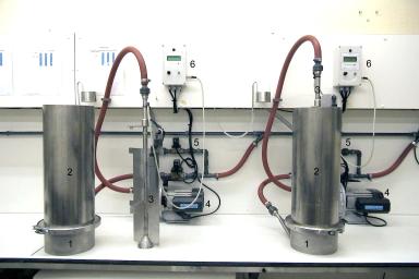 Subsequently, the sample (in the 0,4% Calgon solution) is washed in the cylinder. The suction tube (rocket) is placed inside the cylinder and lifted to the highest position and connected to the pump tube. The plug of the two floating waterlevel detectors must be connected to the controlbox. Attach the tube of the Calgon solution with a clip to the suction tube.