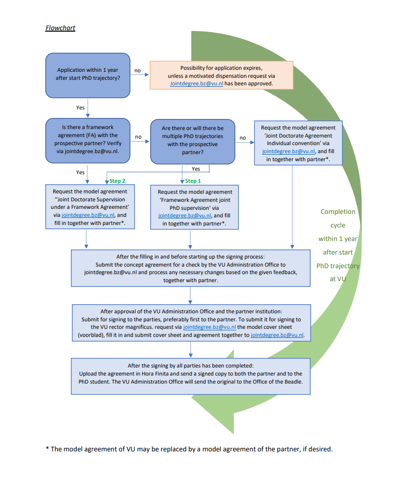 A joint doctorate entails a joint PhD trajectory and a joint PhD at two different universities. This is described in article 33 of the Doctorate Regulations VU. In a joint PhD trajectory, the PhD candidate carries out the research under the responsibility of a supervisor at VU Amsterdam and a supervisor from another university or institution. This leads to a joint degree. This means that you will be awarded a doctoral degree at two or more universities at the same time. The arrangements about this are laid down in a cooperation agreement between the partner institutions involved. The cooperation agreement must be approved by the rector magnificus.