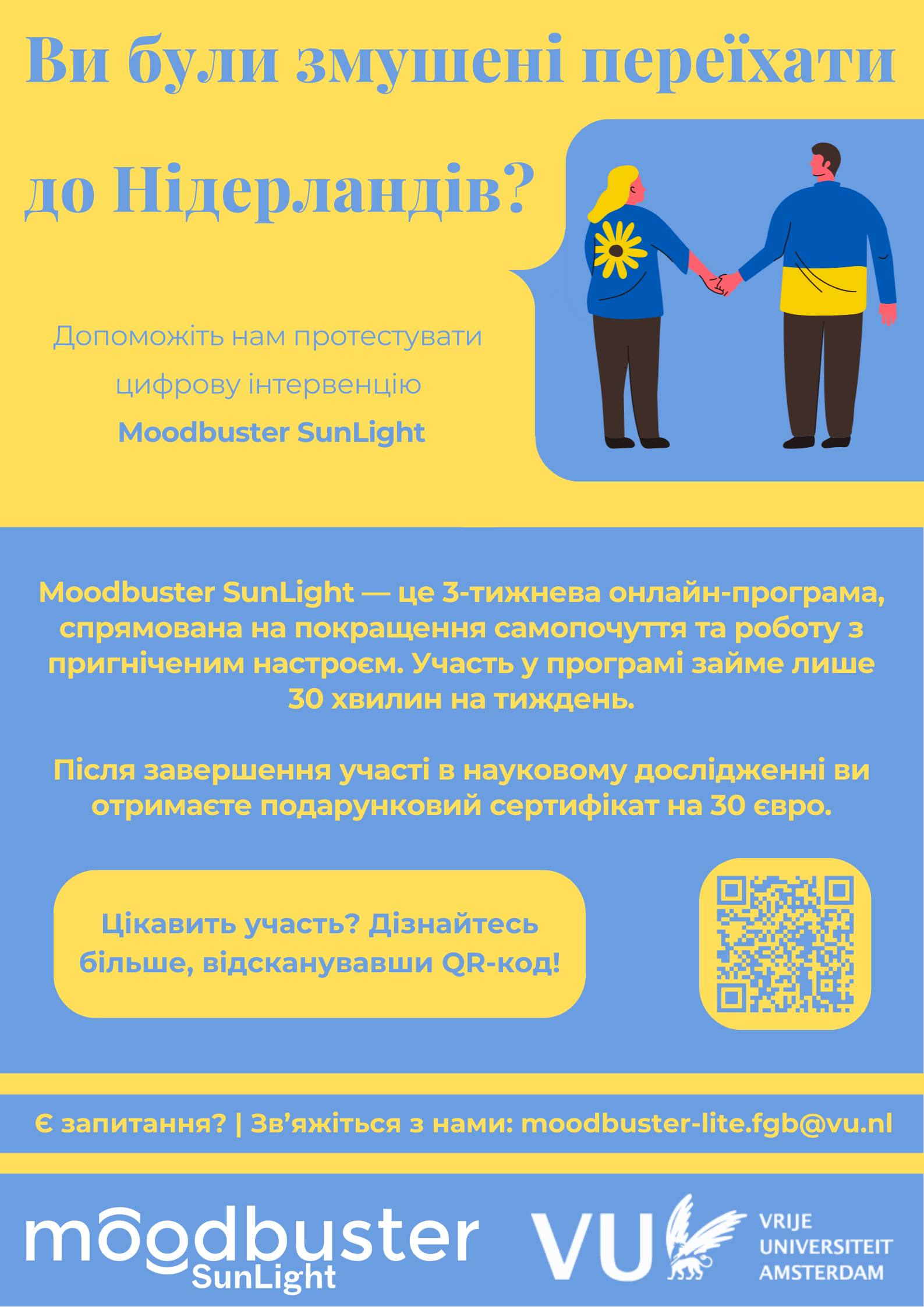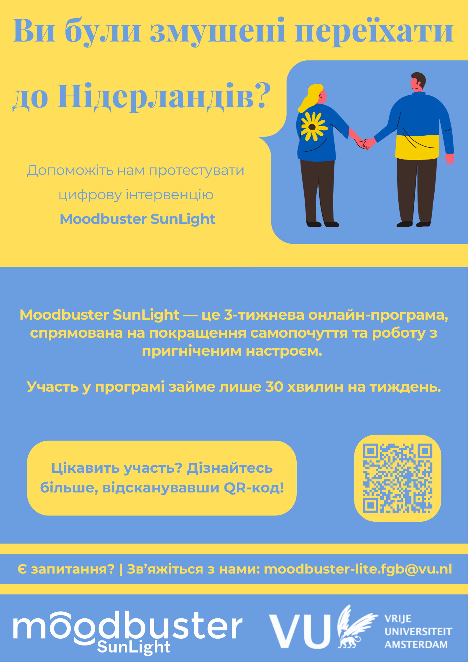 Moodbuster SunLight — це 3-тижнева онлайн-програма, створена для вимушено переміщених українців, які проживають у Нідерландах.
