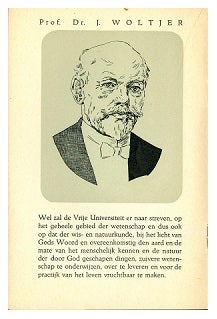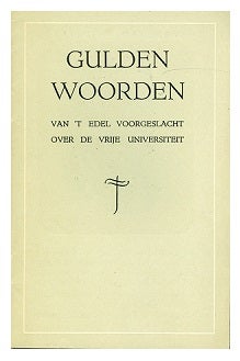An example of that propaganda material is the brochure 'Gulden woorden van 't edel voorgeslacht over de Vrije Universiteit'. The brochure is undated. Opposite the authorisation to be completed is the text 'The Heroes have fallen. The best have passed away.... But their word remains sound, and We want to be so too. Their sons not degenerate.' Inside are drawings by Groen van Prinsterer, Kuyper, Bavinck, Lindeboom, Rutgers, Fabius, Woltjer, Idenburg, Knap and Colijn, a kind of sample of the Reformed, scholarly column. Each drawing is accompanied by a quotation, with the ultimate aim: fill in that authorisation.