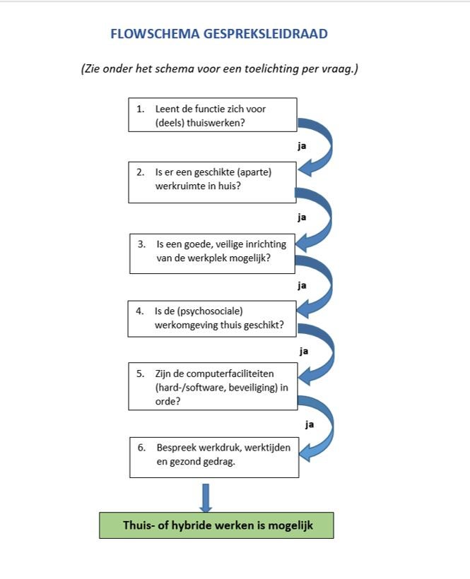 Dit flowschema biedt een gespreksleidraad voor medewerker en leidinggevende. Hierin komen stapsgewijs de belangrijkste aspecten (niet limitatief) aan bod die te maken hebben met de werkgeversverantwoordelijkheid (Arbowet) van de VU m.b.t. gezond thuiswerken van medewerkers. Worden een of meer vragen met nee beantwoord, dan is thuiswerken niet mogelijk of alleen met extra (werk)afspraken, maatregelen of (IT-)voorzieningen. Als het niet lukt om thuis goed te werken, dan is gebruikmaken van een werkplek op de campus noodzakelijk.