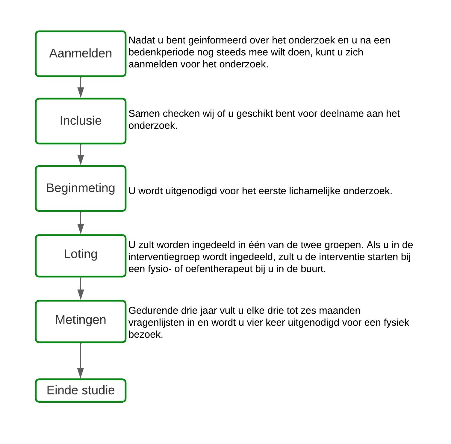 Het onderzoek zelf duurt drie jaar. Gedurende die tijd ontvangt u vijf keer een uitgebreide vragenlijst en vier keer een korte vragenlijst. U wordt vijf keer uitgenodigd voor een meetbezoek, waarbij bij drie van die bezoeken ook een klein beetje bloed wordt afgenomen. Deze meetbezoeken duren hooguit een half uur. Daarnaast krijgt u vijf keer een activiteitenmeter thuisgestuurd die u een week lang moet dragen.