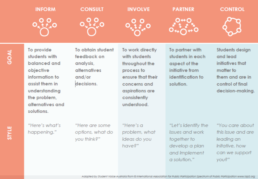 Studenten kan je betrekken op verschillende niveaus: informeren, raadplegen, betrekken, partnerschap en gedeeld leiderschap. Hierin is informeren het niveau waarin studenten de minste impact hebben en gedeeld leiderschap het niveau waarin iedereen dezelfde zeggenschap heeft over elk deel van het proces. De overige vormen van samenwerken zitten hiertussen. Het is belangrijk om te beseffen dat het ene niveau niet beter of slechter is dan het andere. Ook hoeft binnen een samenwerking niet één vaste vorm te zijn.