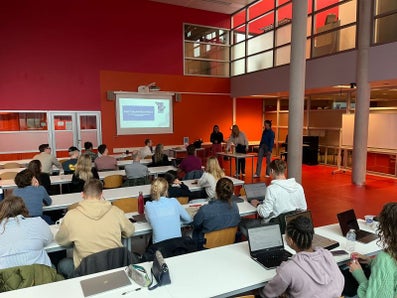 Het vak sluit af met een bijzondere bijeenkomst: een soort ‘dragons’ den’ waarin alle maatschappelijke partners samenkomen. De studentengroepen presenteren hun bevindingen en adviezen aan een panel van de betrokken organisaties, dat fungeert als jury. Deze vorm zorgt voor een levendige, praktijkgerichte afsluiting en biedt studenten waardevolle feedback direct vanuit het werkveld.