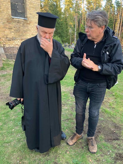 Datum: 12 oktober 2023. Afbeelding: Karel Onwijn (rechts) in gesprek met een geestelijke (links) in Estland.