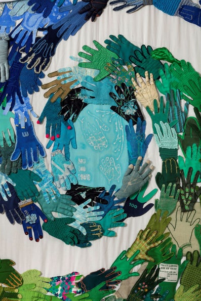 Bij het honderdjarig bestaan van de VU in 1980 schonk Vrouwen VU-Hulp dit wandkleed met daarop verbeeld de 'Helpende handen' van de ijverige spaarsters - in alle mogelijke vormen en materialen. Initiatiefneemster was mevrouw J. Bonker-Blotevogel, een van de provinciale vertegenwoordigsters.